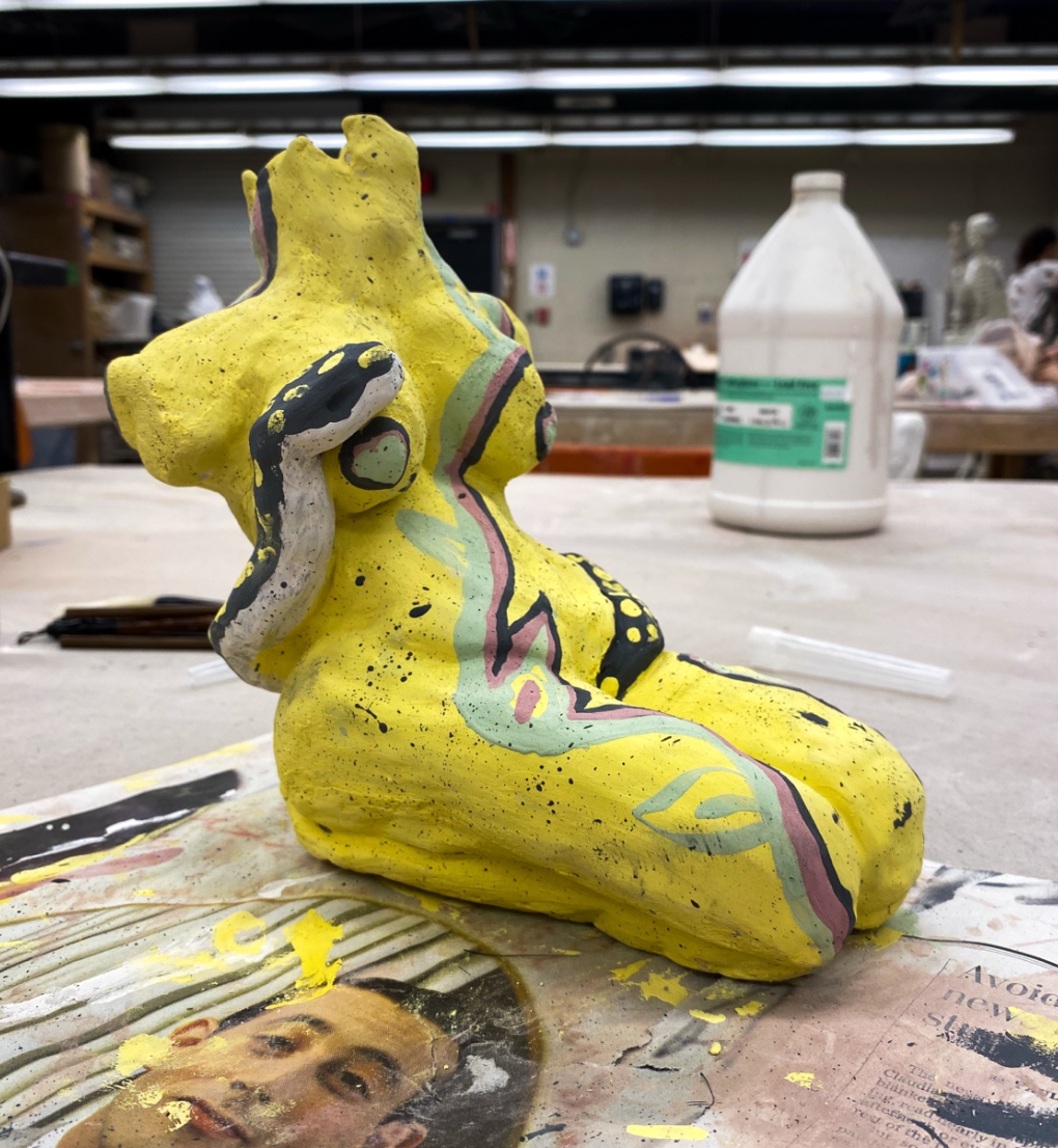 The blue sculpture represents a stingray, an animal that moves gracefully through its environment. Its fluid form and glossy glaze echo the calm yet powerful rhythm of the ocean. The dark vessel explores growth and transformation through layered textures and deep tones, while the yellow figure connects the human body to the natural world, expressing vitality and motion.